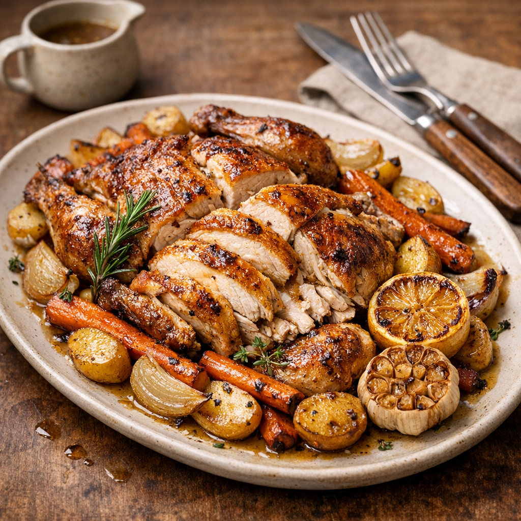 A gentle, low-and-slow roast chicken nestled over sweet root vegetables, finished with a buttery pan sauce. The kind of meal that perfumes the house, asks nothing of you but time, and rewards you with tender meat and caramelized edges.