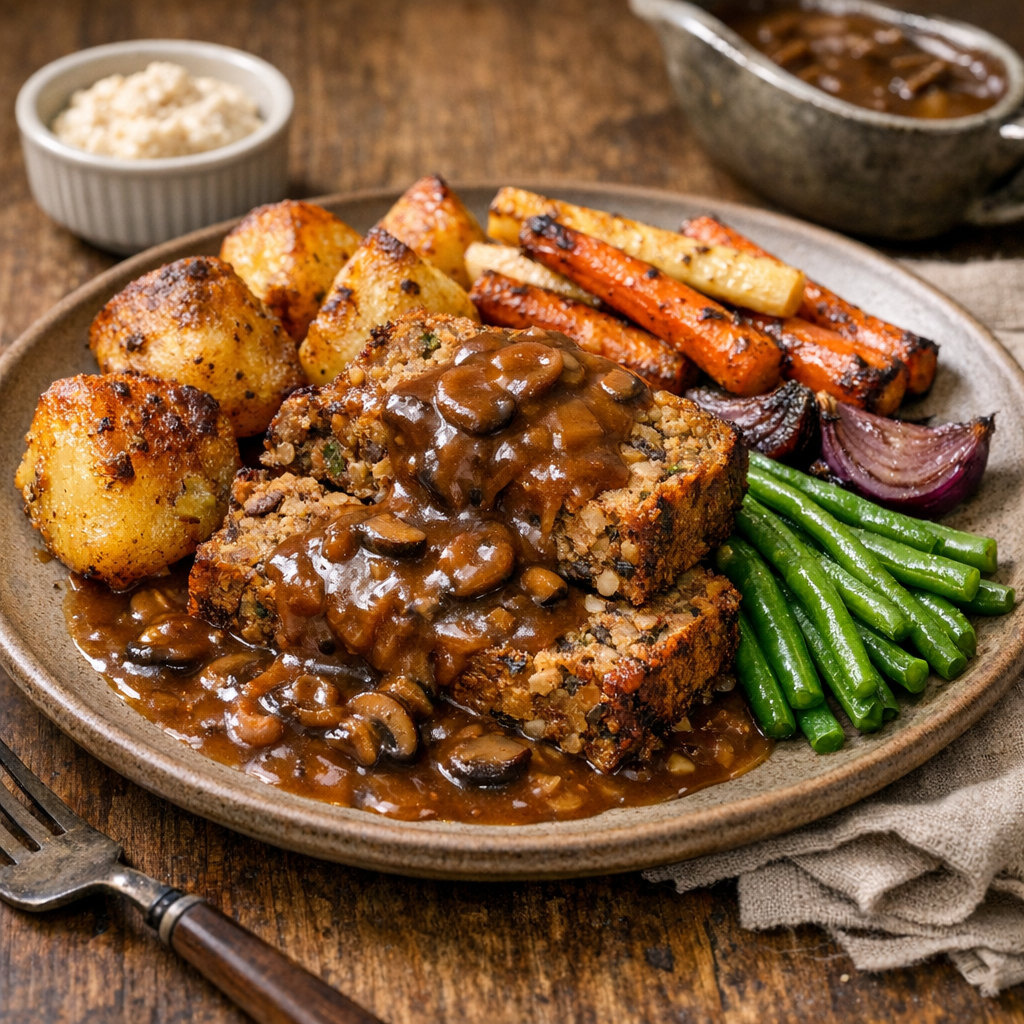 Serve: plate slices of the vegetarian roast with the roasted vegetables, ladle over plenty of gravy, and add greens on the side if you like. Let everyone help themselves—this is the kind of meal that’s better when it’s unhurried.