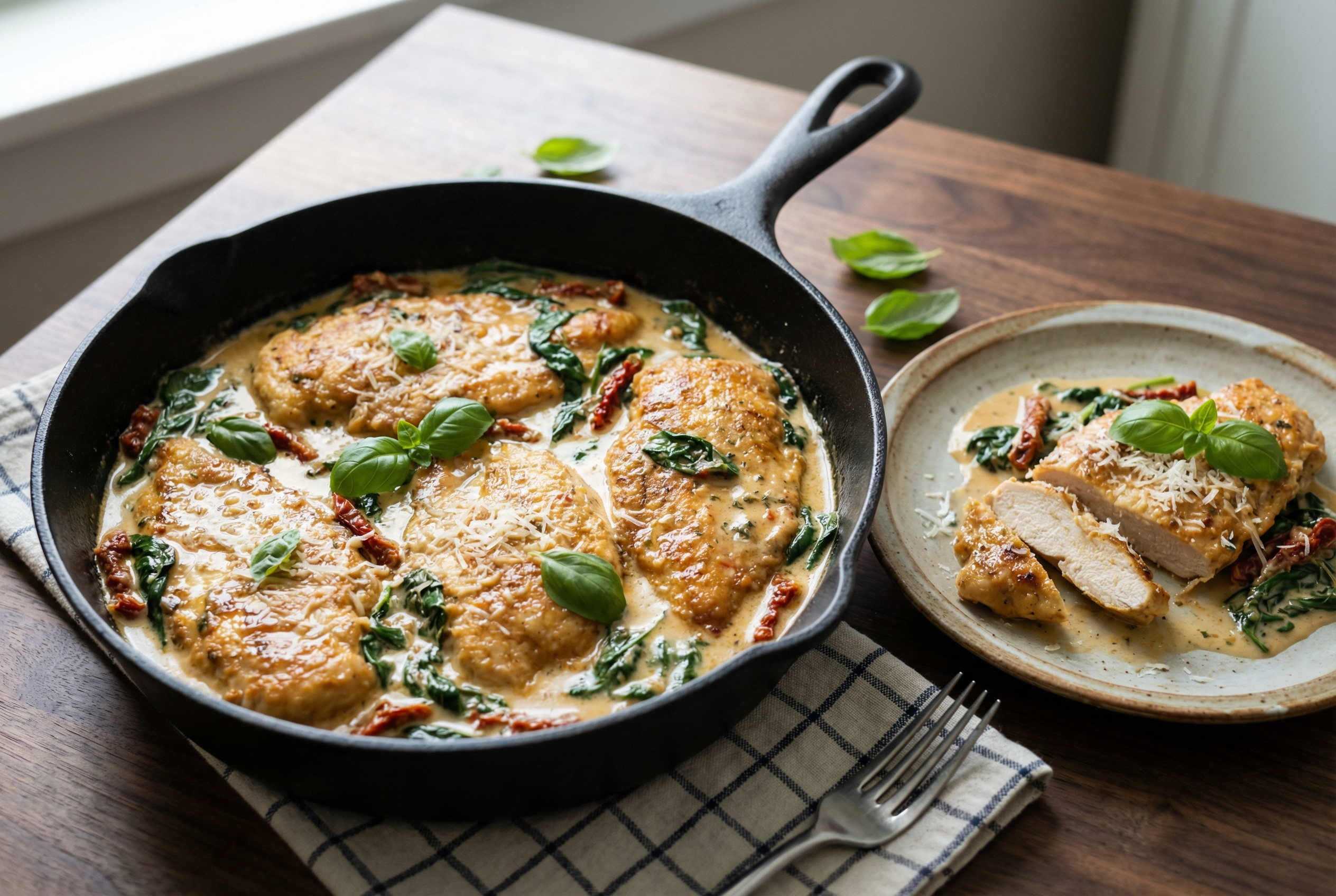 A fast, family-friendly skillet dinner with tender chicken, a garlicky creamy Parmesan sauce, and classic Tuscan add-ins like sun-dried tomatoes and spinach. Perfect for busy weeknights—one pan, big flavor, and on the table in about 20 minutes.