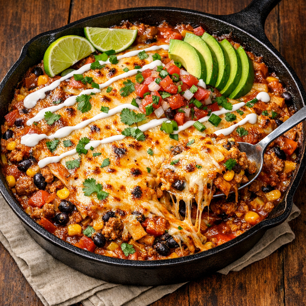 This is the dinner I make when everyone’s hungry and I’m not in the mood to fuss with rolling tortillas. Everything gets layered right in the skillet, baked just long enough to melt the cheese, and it tastes like you worked way harder than you did. Bonus: it’s super flexible—use whatever protein and beans your family likes.